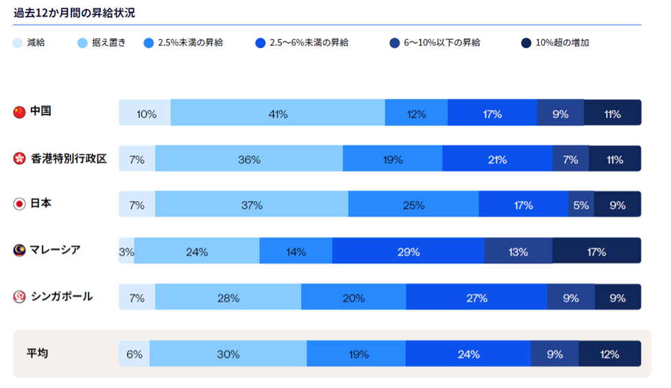 - 過去12か月における昇給において、「減給」は中国が最も多い10%。一方で、6%以上の昇給はマレーシアが最も多い(30%)、中国(20%)、香港(19%)、シンガポール(18%)、日本(14%)となっている。(図4)